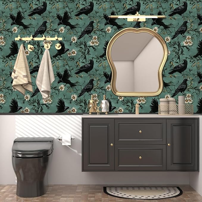 Crow Peel and Stick Wallpaper 17.4" x 394" Gothic Contact Paper Witchy Self Adhesive Removable Covering for Bedroom Bathroom Cabinet Drawer Halloween Vintage Raven Wall Decor Dark Grey Green