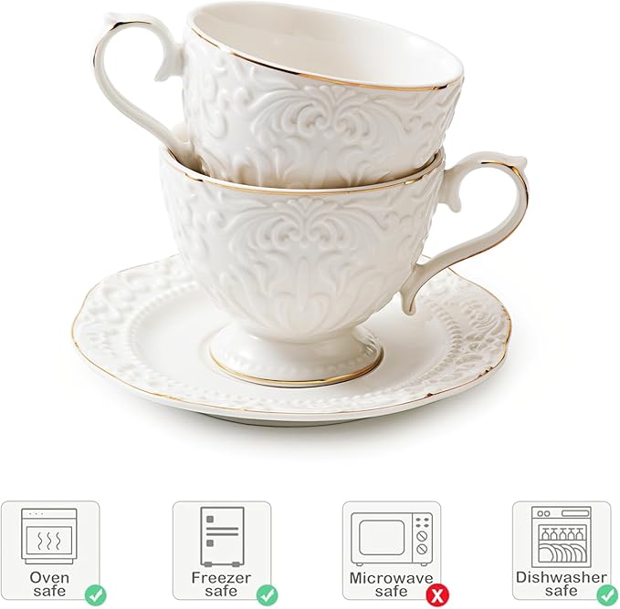 - Note: The Ceramic coffee cup set is dishwasher safe but we recommend hand wash for durability and the gold trim over the cup and saucer is not safe for heating, so please do not put the cups and saucers into the microwave.