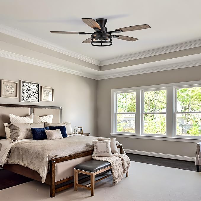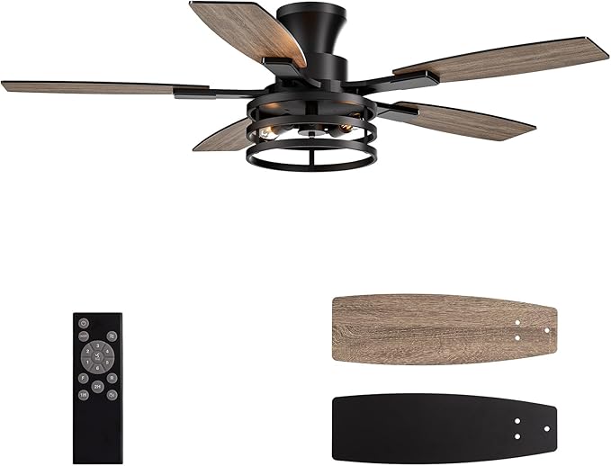 52 Inch Flush Mount Ceiling Fans with Lights and Remote Control, Low Profile Farmhouse Ceiling Fan for Bedroom Living Room and Patio, Black Caged Ceiling Fan for Indoor and Outdoor