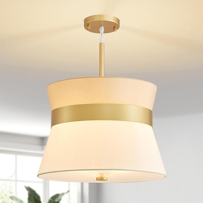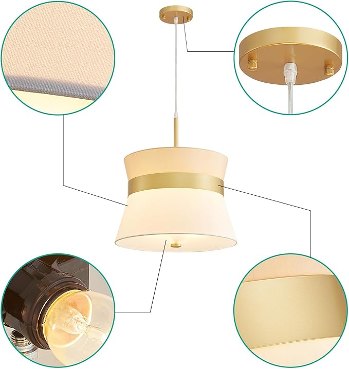 - Gorgeous Appearance: This pendant light boasts a waist - tapered circular lampshade crafted from textured fabric, highlighted by a sleek gold metal band. Bottom with glass cover, the blend of the fabric’s soft, natural texture and the gold’s polished sheen strikes a perfect balance between warmth and modern elegance. When lit, the fabric shade diffuses a gentle, inviting glow; when unlit, the contrast of creamy beige fabric and shimmering gold creates a refined, welcoming look. It suits dining rooms, living rooms, and more, infusing spaces with understated luxury.
