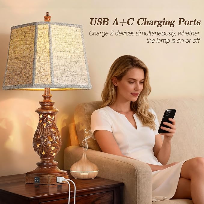 - USB A+C Charging Ports: Each lamp features 2 convenient USB charging ports. Charge two devices simultaneously – phones, tablets, e-readers – whether the table lamp is on or off. Super handy for your bedside essentials.