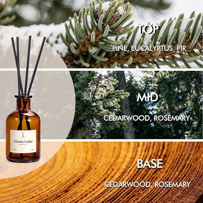 Balsam Cedar Reed Diffuser Set - Includes Reed Diffuser Sticks, 2 Pack Fragrance Oil and Glass Bottle, Reed Diffusers for Home Bathroom Shelf Decor & Gift, Air Fresheners (8.12 fl.oz)