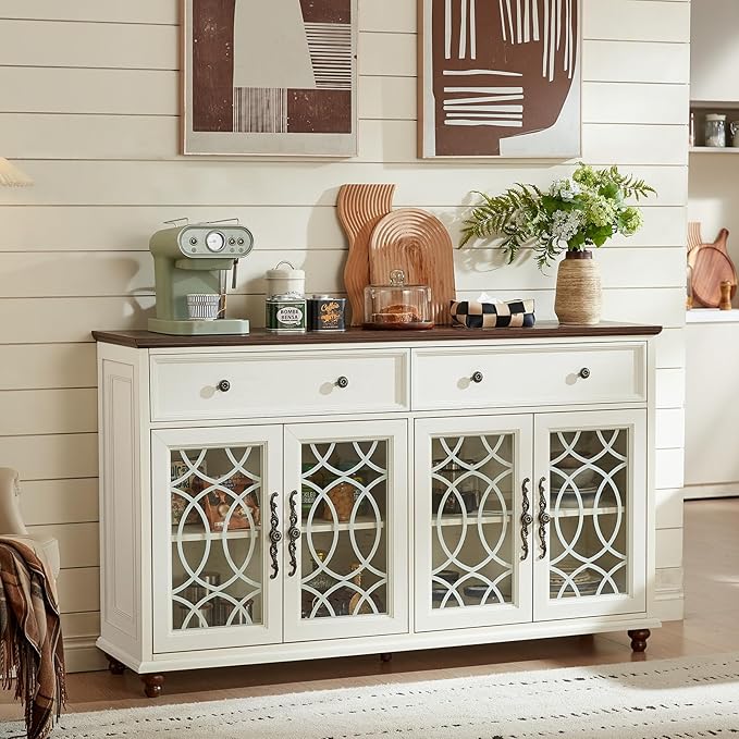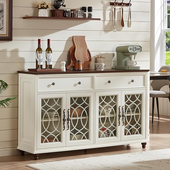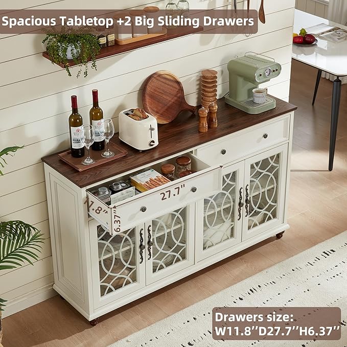 Large Sideboard Buffet Cabinet with Storage,59" Credenza with 4 Glass Doors & 2 Drawers,Adjustable Shelves Coffee Bar,Wood Kitchen Console Table for Dining Room,Living Room,White
