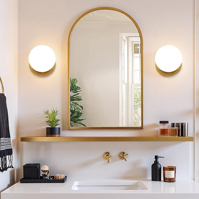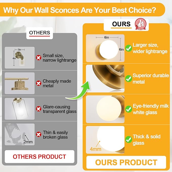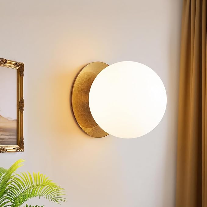 - 【High-Quality Materials】 – Crafted with sturdy all-metal construction, this gold wall sconce offers long-lasting durability and a refined, premium feel. The thick milky glass shade softens the light for a comfortable, eye-friendly glow, while the upgraded gold finish is scratch-resistant and easy to maintain—keeping your fixture looking polished over time.