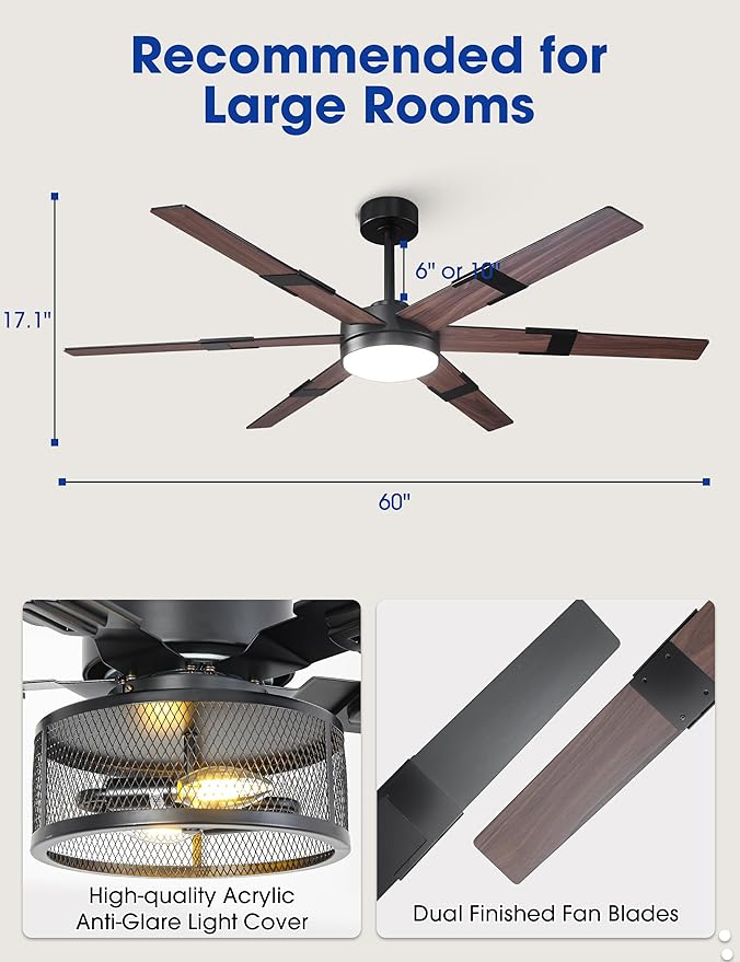 - Easy Installation & Versatility: Includes 6" and 10" downrods for flexible mounting options. Ideal for large spaces like living rooms, bedrooms, and offices. Backed by a reliable motor and quiet operation.