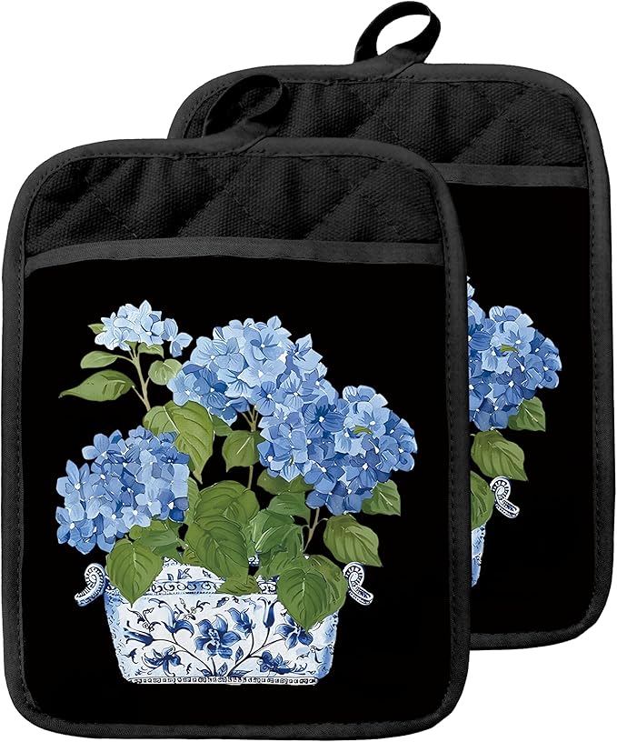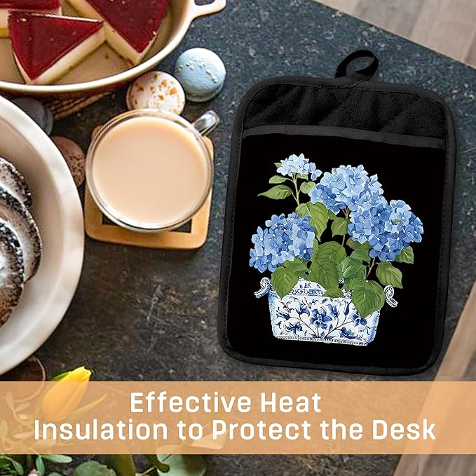 Chinoiserie Blue Hydrangea Pot Holders with Pockets, Grandmillennial Blue and White Porcelain Floral Oven Pot Holders Heat Resistant Oven Mitts Hot Pads for Kitchen Baking Cooking