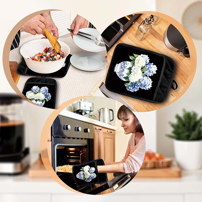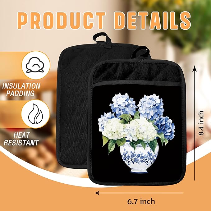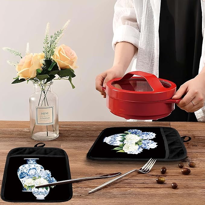 Chinoiserie Hydrangea Floral Pot Holders with Pockets, Blue and White Porcelain Hydrangea Flower Oven Pot Holders Heat Resistant Oven Mitts Hot Pads for Kitchen Baking Cooking