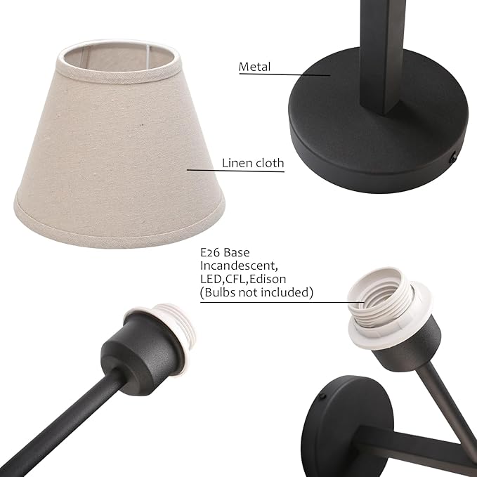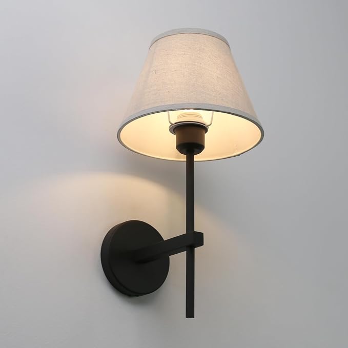 - 【Linen Cloth Sconce】 With pure texture, natural linen fabric. The flared linen fabric lampshade features a vintage-inspired design, combining an elegant metal arm that provides an artistic ambiance, blending vintage charm with modern appeal. The refined fabric style diffuses light beautifully, creating a soft, welcoming glow. Perfect for bathrooms, bedrooms, living rooms, dining rooms, reading rooms, hallways, cafes, bars, kitchens, entryways, hotels, or foyers.
