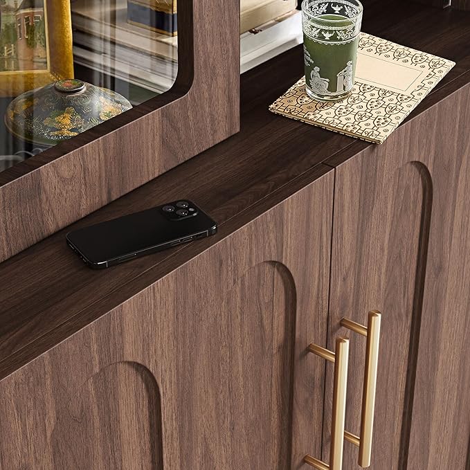 - [Solid Construction with Anti-Tipping Safety] Constructed with high-quality wood and tempered glass, this freestanding kitchen pantry cabinet with glass doors combines a walnut-toned finish with solid craftsmanship. Equipped with an anti-tipping device, this tall wine bar cabinet with glass doors and shelves ensures safety for families, allowing secure storage of heavy or fragile items without risk of tipping