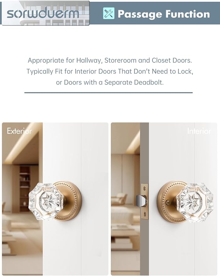 - PASSAGE FUNCTION: The Passage Door Knob for Use on Interior Doors Requiring No Locking Functionality, Such as Hallway,Closet Doors and Passage Doors