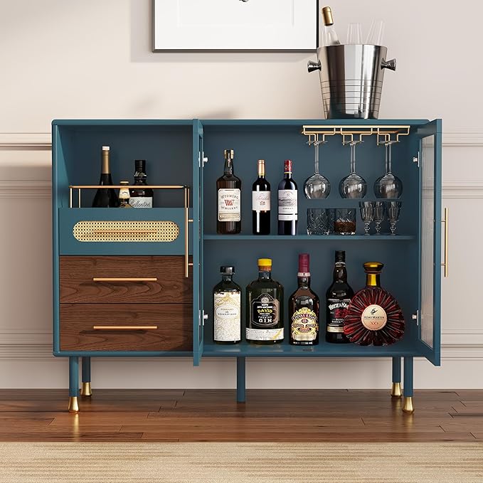 ARTPOWER 48" Coffee Bar Cabinet with Wine Racks and Drawers, Modern Buffet Sideboard with Pull-Out Wine Storage, Liquor Bar Cart for Kitchen, Dining Room, Living Room (Blue)