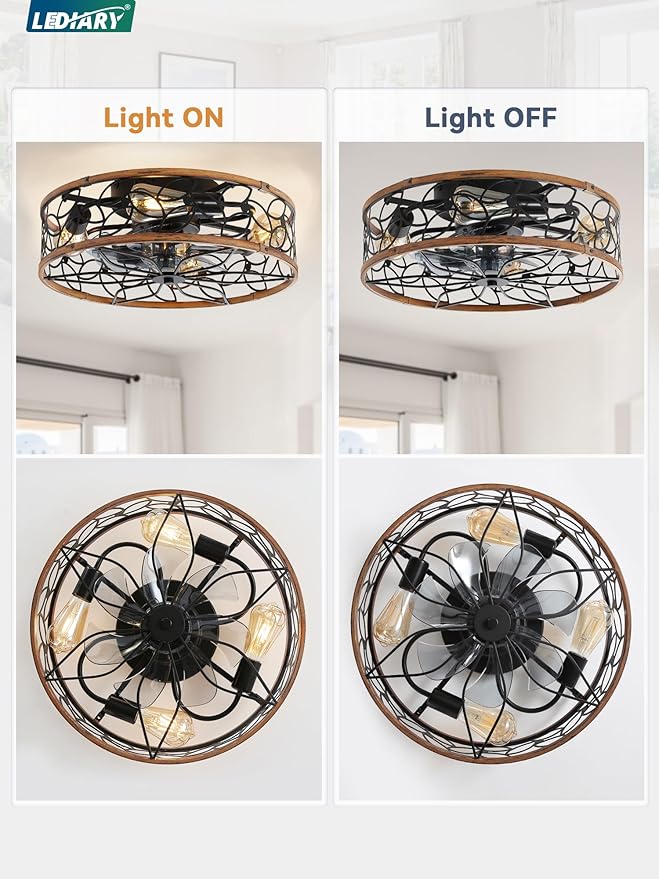 LEDIARY 23 Inch Caged Ceiling Fans with Lights, Farmhouse Flush Mount Ceiling Fan with Remote, Black&Walnut Low Profile Ceiling Fan Light Fixture for Bedroom, Kitchen, Dining Room