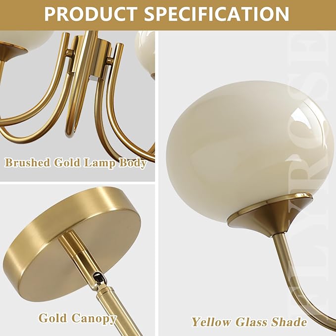 - Vintage Yellow Glass Shade: This gold glass pendant light featured with vintage yellow shade, which is beautiful and unique. This 5 light glass globe chandelier is known for its modern and classic style, which makes it suitable for most of occasions