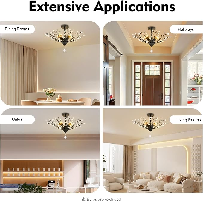 - Versatile Lighting:110V branches pendant light accommodates 5 E12 screw-in bulbs (incandescent/LED,not included) for bright,unobstructed illumination.Crystal decorations enhance beauty without blocking light,fitting various indoor styles and atmospheres