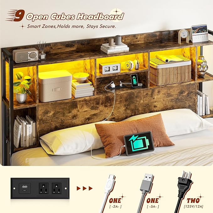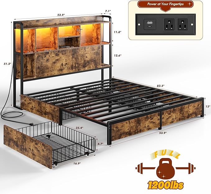 Full Size Bed Frame with Storage Headboard & 4 Large Drawers Bed Frame Full Size with 51" Tall Headboard 9 Compartments Led Lights & Charging Station,No Box Spring Needed, No Noise,Vintage Brown
