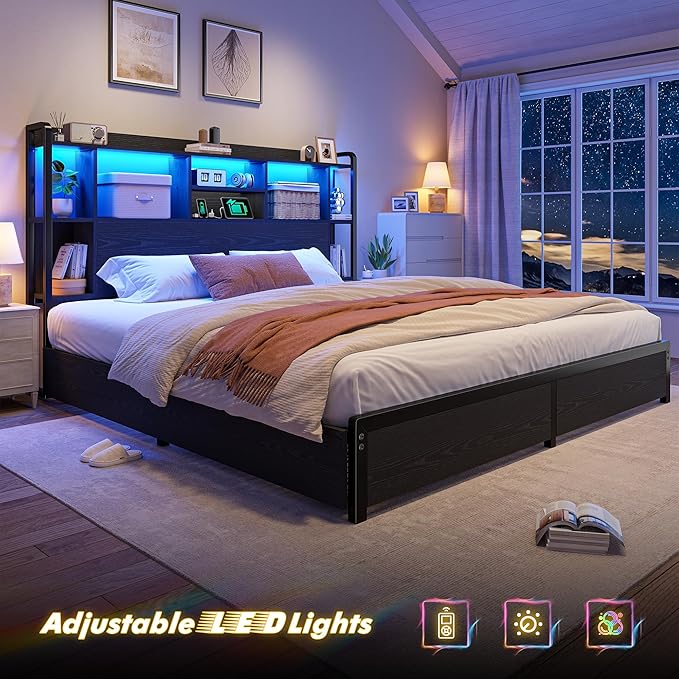 King Size Bed Frame with Storage Headboard & 4 Large Drawers King Bed Frame with 51" Tall Headboard 9 Compartments Led Lights & Charging Station,No Box Spring Needed, No Noise,Black
