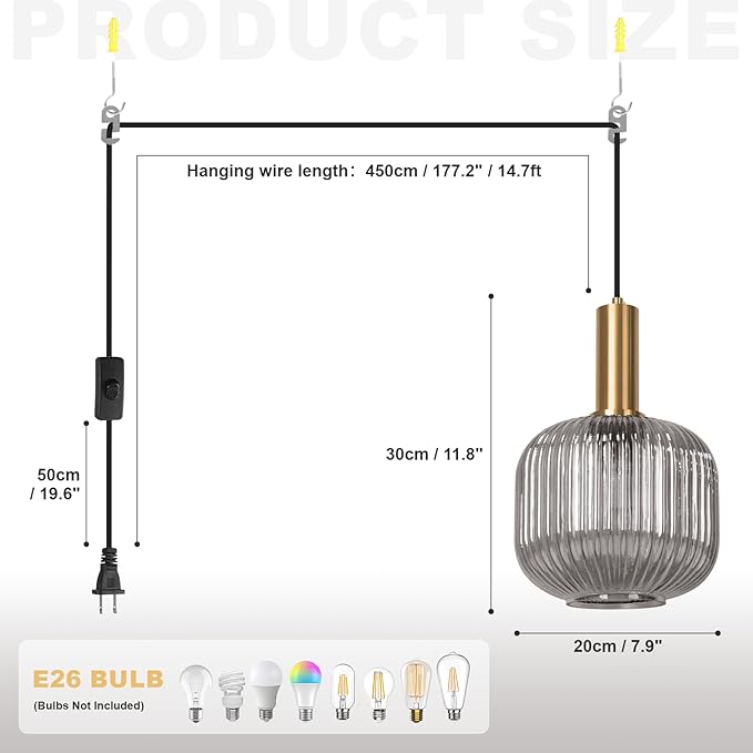 - 【Standard Bulb Type】Rated 110-240V, this hanging globe light works with E26 bulbs (not included), like incandescent, LED, CFL or halogen bulbs up to 60W. Control on/off via cord switch. Safe and efficient for daily use as plug in pendant lighting with cord.