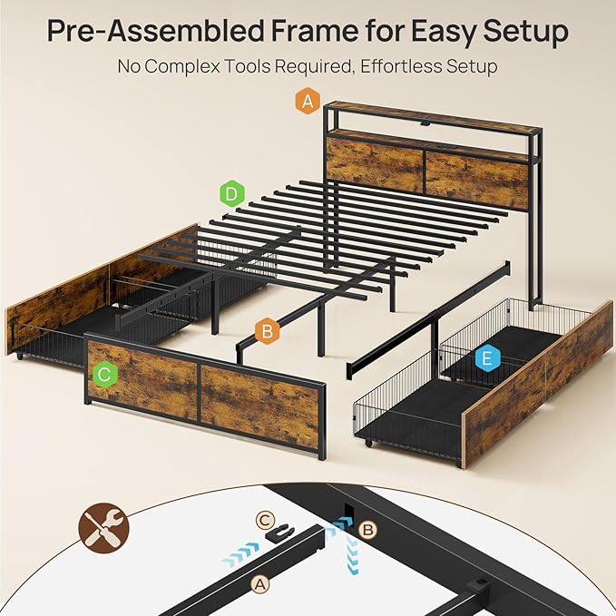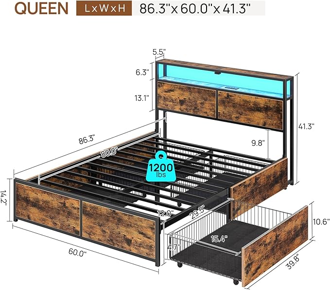 Rolanstar Queen Bed Frame with 4 Storage Drawers, Charging Station and LED Lights, Metal Platform Bed with 2-Tier Storage Headboard, No Box Spring Needed, Easy Assembly, Noise-Free, Rustic Brown