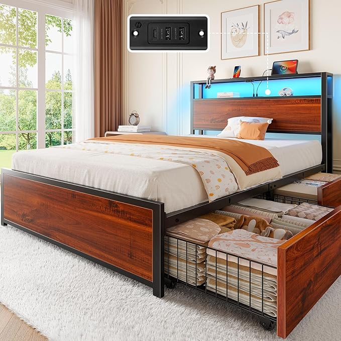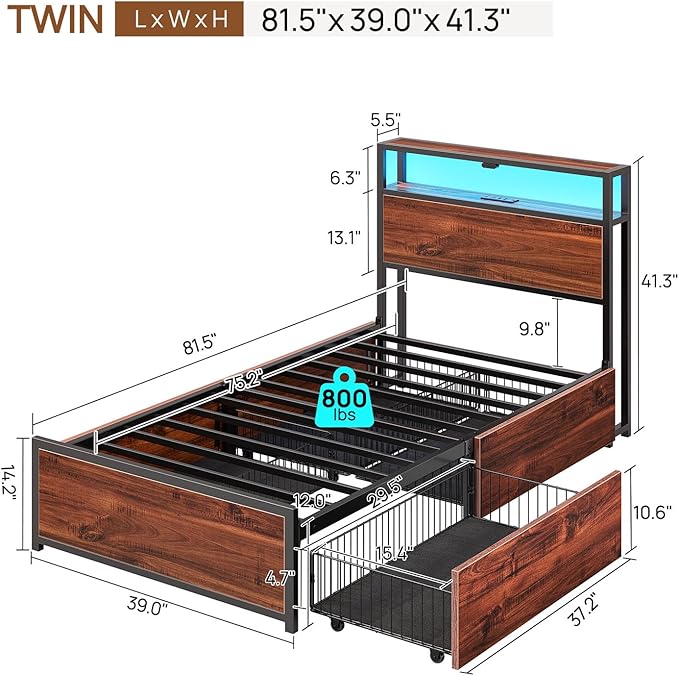 Rolanstar Twin Bed Frame with 4 Storage Drawers, Charging Station and LED Lights, Metal Platform Bed with 2-Tier Storage Headboard, No Box Spring Needed, Easy Assembly, Noise-Free, Walnut